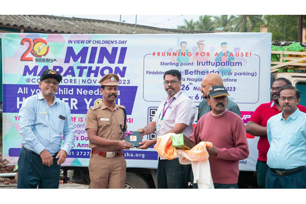 On Sunday, November 26th, 2023, the mini-marathon event was held at Iruttupallam, Coimbatore,commemorating Children’s Day and SEESHA’s 20th anniversary. More than 250 people participated in the event, which was flagged off byMr. Senthil Kumar, I.P.S., Superintendent of Police, Coimbatore. The top 3 winners were awarded medals and gifts by SEESHA’s Trustee – Dr. Samuel Thomas. In recognition of their exuberance and zeal in participating in the competition, all the participants were awarded participation certificates.