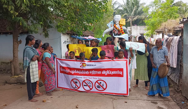 More than 50 children from the SEESHA Learning Centres and youth from the local community joined the mock funeral procession and took the effigy of substance addiction on its final farewell march, as a culmination of SEESHA's month-long deaddiction sensitization campaign, 'New Year, New You!', when the village elders sang 'Oppari', lamenting against the toxic ties people form with illicit substances that sabotage their lives for decades, locking them in cycles of dysfunction.