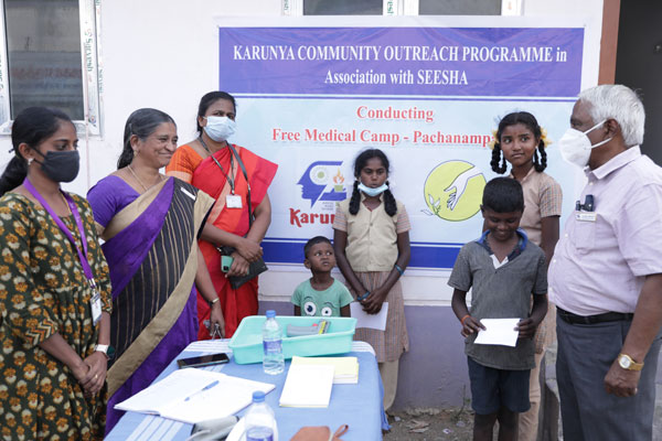 To improve healthcare access to the surrounding tribal families and raise the quality of service provided, SEESHA in association with Karunya Deemed University, conducted a health awareness & medical outreach program at Pachanampathy village – Coimbatore district on February 8, 2022. Medical team from Karunya Hospitals conducted the health camp & several community members underwent general health and dental check-ups during the campaign. Necessary supplements & medicines for common ailments were provided to the beneficiaries free of cost, and patients who required further investigation were referred to the hospital.